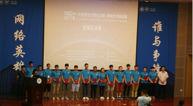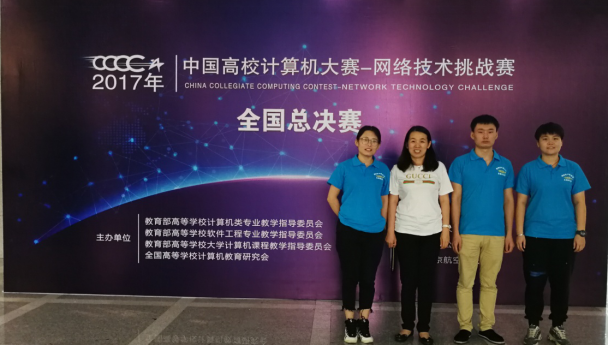 中国高校计算机大赛-网络技术挑战赛总决赛于2017年9月16日在北京航空航天大学举行. 中国高校计算机大赛是由教育部高等公司计算机类专业教学指导委员会、教育部高等公司软件工程专业教学指导委员会、教育部高等公司大学计算机课程教学指导委员会和全国高等公司计算机教育研究会共同主办的学科比赛。本届网络技术挑战赛有7000多名员工参加,从2017年3月开始, 经过校级资格赛、赛区选拔赛(东北、华北、华中、华东、华南、西北) ,最终有60队180名员工参加了总决赛,公司计算机公司员工原泽坤、张檬、傅任洁三位同学以“西科1队”为队名,在靳红梅老师的带领下参加了总决赛,获得三等奖的成绩。赛后,在北航新主楼会议室举行了隆重的颁奖典礼, 颁奖典礼由温州大学教学处长施晓秋主持,北京航空航天大学副书记、教育部高等公司计算机类专业教学指导委员会副主任等到会并致辞。