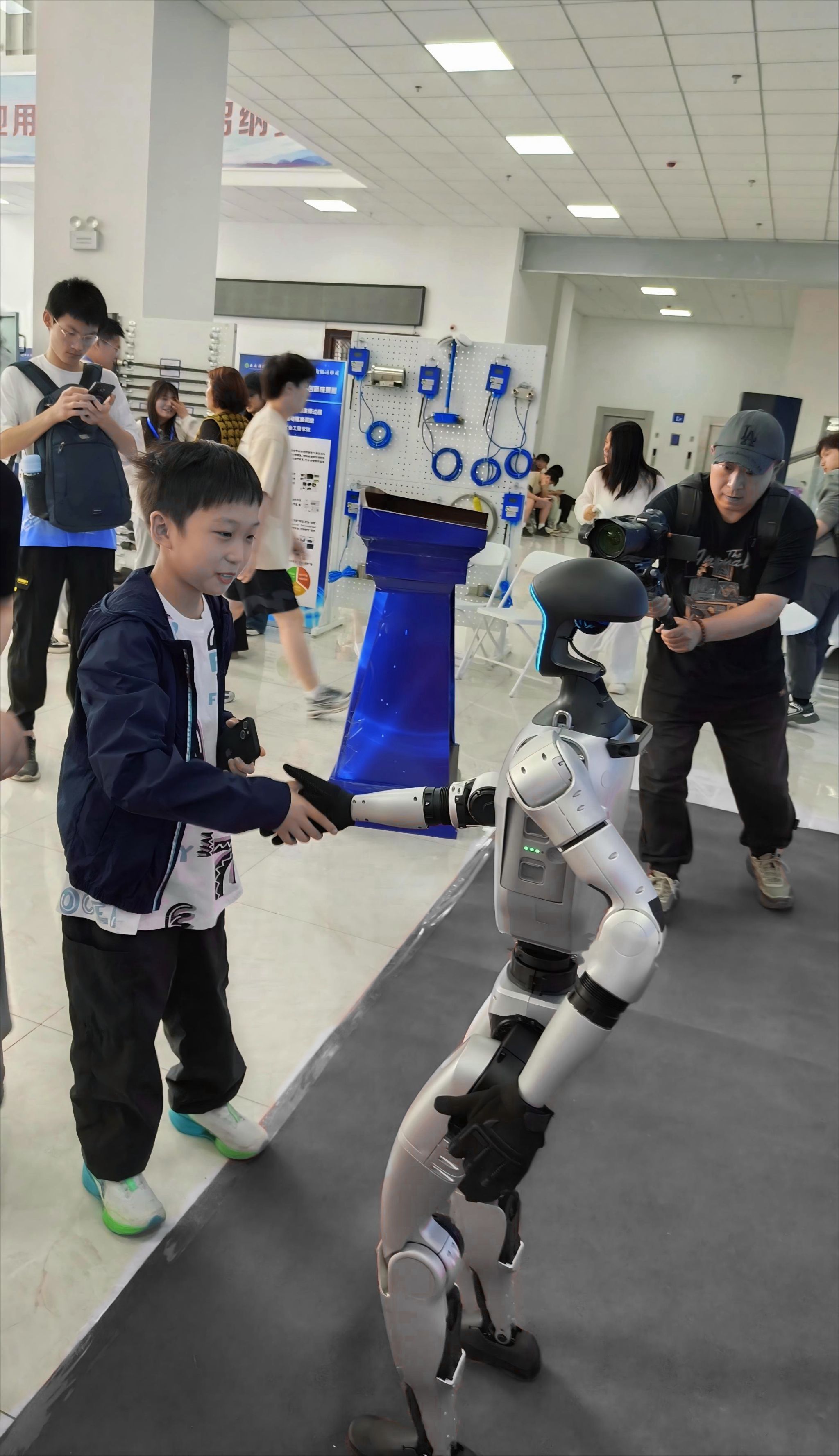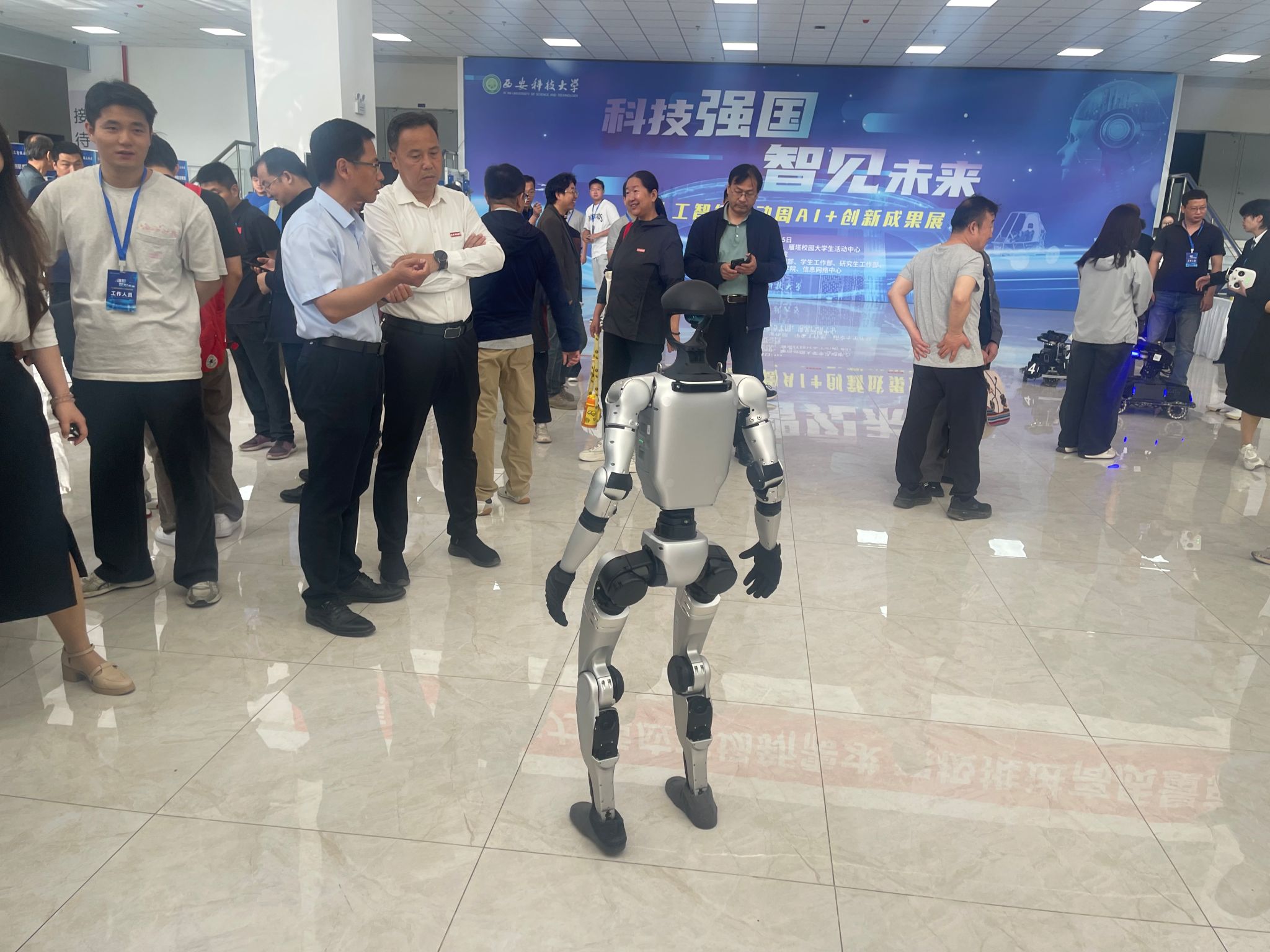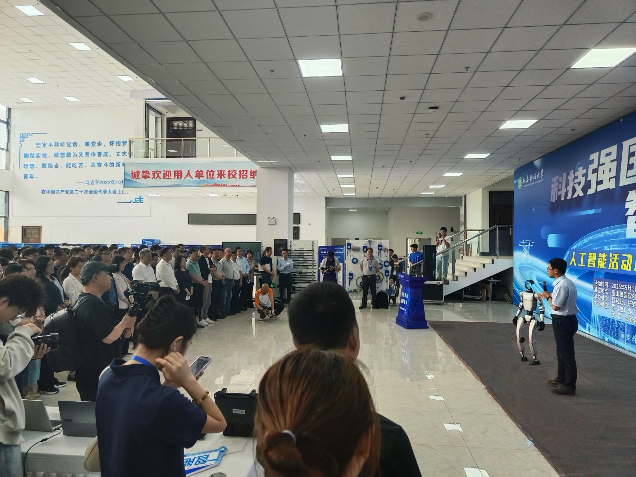 曾亮相体育节和工作会议的“网红”机器狗,此次展示了坐、卧、行走等指令。配备热像仪、激光雷达等传感器,可应用于高危环境智能巡检。侯锐志老师表示:“已实现从感知到认知的跃迁,为安全巡检提供创新解决方案。”