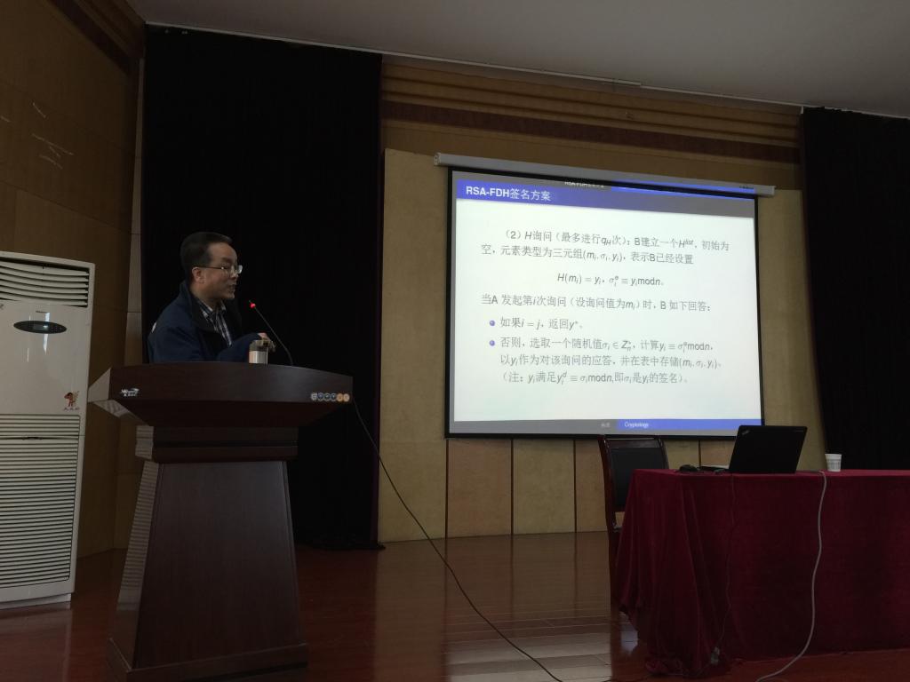 杨波教授对该领域的相关概念进行了介绍。首先,介绍了可证明安全性的发展、定义和使用的数学工具,该领域的研究工作起源于Shannon的完善保密理论,但该理论依赖于无限的计算能力,使其缺乏实际指导意义。近年来,通过引入计算复杂性、概率算法和随机预言模型,使得可证明安全的研究逐步走向实用。随后,杨波教授以基于身份的加密方案为例,介绍其使用方法,使得员工能够严格的分析和证明现代密码学方案的信息防护能力。同学们纷纷表示通过此次报告会收获了很多知识,开拓了眼界,增强了自己的学习热情和信心。