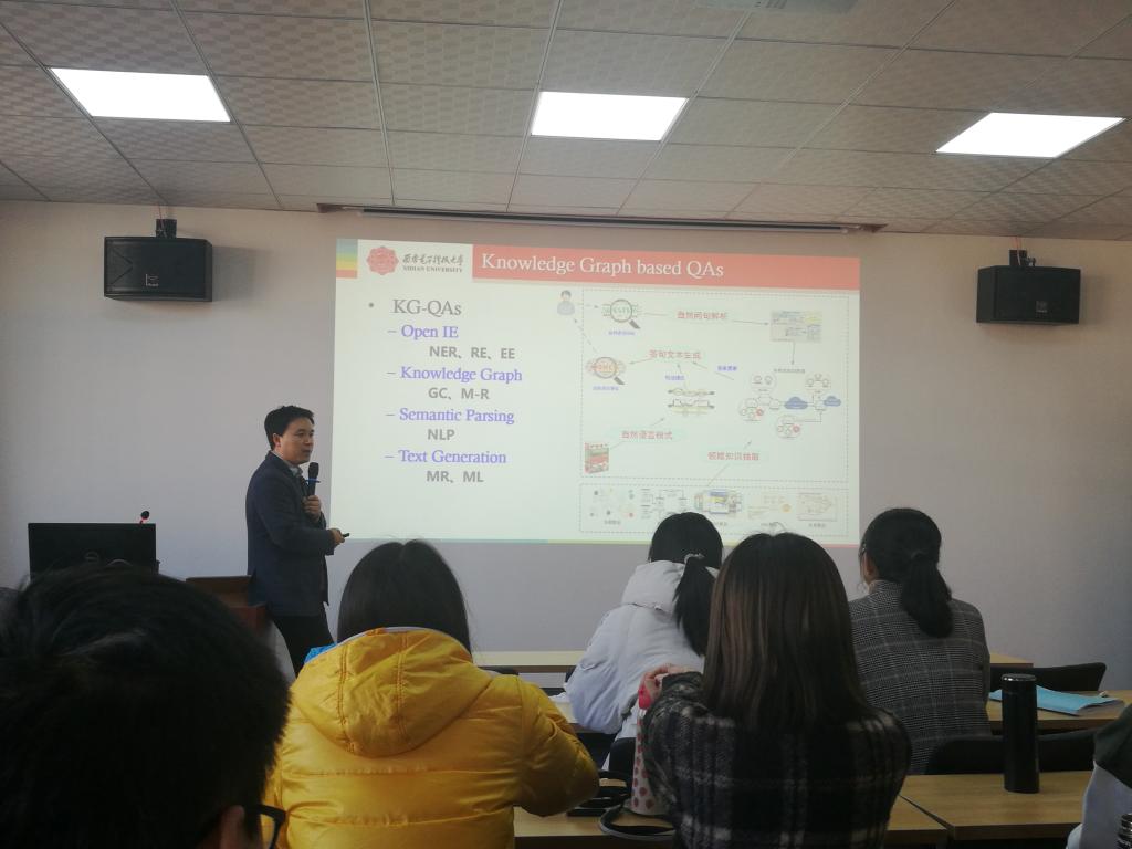 首先,马经理简单介绍了宋教授的研究方向,以及科研成果。接着,宋教授就向大家讲述了基于知识图谱的智能问答技术。报告以自然语言处理、知识图谱和机器学习为基础,详细介绍知识图谱构建、知识融合、存储和查询转换等关键技术及其典型应用,深入探讨基于知识图谱的智能问答关键技术体系及应用前景,由浅入深,由表及里层层递进。之后,宋教授也向大家展示了有关的科研成果,即智能问答的应用场景。最后宋教授向大家传授了关于科研创新的一些技巧,并提醒同学们要自主创新,自主发现问题并努力去寻求解决方案。
